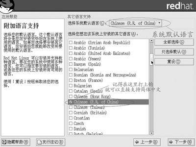 RedHat支持世界上几乎所有国家的语言,这里只要在简体中文前面打上钩,并将系统默认语言选择为简体中文(图2),那么在安装过程结束,系统启动后,整个操作系统的界面都将是简体中文的了,用户不用做任何额外的中文化操作和设置。