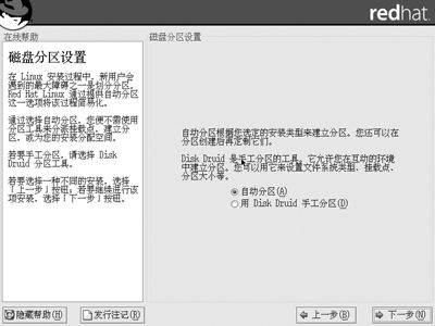 接下来,是磁盘分区的工作,这也许是整个安装过程中唯一需要用户较多干预的步骤,REDHAT Linux 9.0提供了两种分区方式──自动分区和使用DISK DRUID程序进行手动分区(图3)。