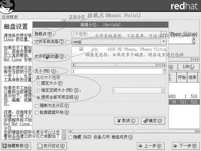 DISK DRUID程序中有明显的新建、删除、编辑、重设等按钮。用户可以直观地对磁盘进行操作。在使用DISK DRUID对磁盘分区进行操作时,有四个重要的参数需要仔细设定:它们是挂载点、文件系统类型、驱动器、分区大小(图4)。