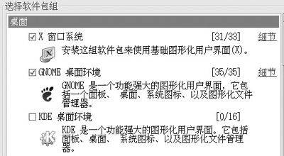 在选择软件包时,如果你想进一步配置系统,可以选定制软件包集合。建议定制,选上KDE桌面环境,这样你就有两个可以和WindowsXP媲美的真彩图标的桌面(图5)。
