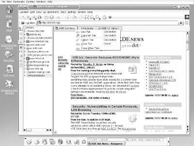 同时,在浏览WEB页面的时候,对各种流行的浏览器功能特性支持也非常好,Javascript、cookie、CSS、Flash等都能在Konqueror浏览器中理想地显示。虽然Linux中有许多优秀的WEB浏览器(NETSCAPE、MOZILLA、OPERA等),但是Konqueror浏览器凭着其高效和快速正在获得越来越多的人的喝彩。