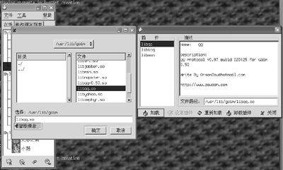 如果你是第一次使用Gaim,你需要装入相应的插件。Gaim缺省提供了很多及时聊天程序的协议插件,比如MSN、ICQ、Yahoo Messager等等,这里我们需要装入QQ协议的插件,如图2。然后选择我们提供的QQ协议插件所在的目录,点击这个文件名,然后选择“加载”(Load),如果你的Gaim版本和你的QQ协议插件的版本一致(Gaim在装入插件的时候需要检查版本号),将出现如图2所示的协议信息,表示QQ协议插件已经正确装载了。