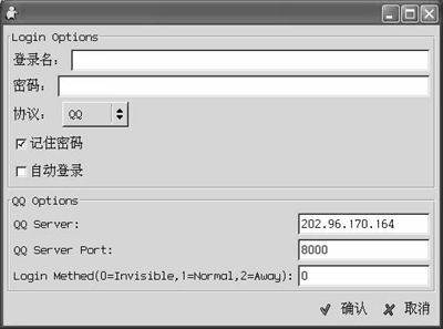 图3是输入QQ号和密码的界面,首先选择协议,这里我们选择的是QQ,会出现和QQ有关的一些设置选项。QQ Server是QQ服务器的IP地址,这个地址可以在Windows版的QQ的网络设置选项中找到。QQ Server Port是QQ服务器的端口号,这个一般都是8000。Login Method是缺省上线的方法,0表示“隐身”登录,1表示“正常”登录,2表示“离开”。添加完账号之后,就可以在账号登录界面中输入账号登录了,可以用Ctrl键选择多个账号同时登录,不同协议的账号也可以同时登录。