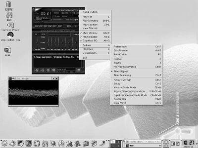 MP3格式无疑是互联网时代最流行的音乐格式,Linux中当然也少不了对MP3的支持。在MS-Windows中,MP3播放软件中最有名的无疑是Winamp,而在REDHAT Linux 9.0中,自带了和Winamp一模一样的MP3播放器──XMMS(X-Window MultiMedia System),它是Winamp在Linux中的克隆版,从外观到使用方法再到功能,都和Winamp没有两样(图5)。