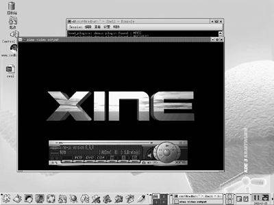 XINE是专为Linux、FreeBSD等UNIX系统设计的媒体播放软件,支持包括MPEG-1、MPEG-2、VCD、DVD、SVCD、AVI和CD-audio等在内的媒体文件,堪称“全能”播放器。更难能可贵的是,它是完全免费的。XINE的功能很强大,连MS-Windows中的很多商业媒体播放软件都望尘莫及。我们可以到http://www.linuxeden.com/download/indexsoft.php?category=multimedia下载XINE的RPM软件发行包。在控制台(Console)界面中,使用“rpm -ivh xine-x.x.x-i386.rpm”(其中x.x.x代表下载的软件的版本号)即可安装,然后,只需在控制台中直接键入“xine”命令即可看到XINE的操作界面了(图7)。