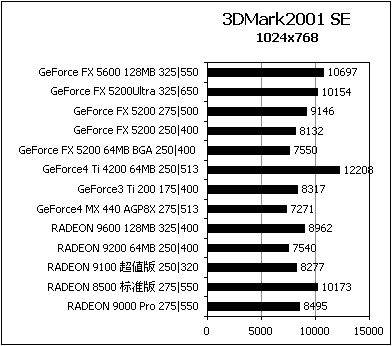 从测试的成绩看,3DMark2001 SE上的分数7000~10000分属于中低端游戏平台(显示卡为GeForce FX 5200级别),只能流畅运行对硬件要求比较低的3D游戏;而达到10000~13000分的平台属于主流游戏平台(显示卡为GeForce FX 5600级别),能流畅运行目前市场上绝对大部分游戏;而达到13000分以上的平台则可以在游戏领域傲视群雄了(显示卡为Radeon 9700/9700 Pro及以上级别),甚至可以打开高层次的过滤(FSAA、AF等)而不怕降低游戏流畅度。若同样级别的显示卡达不到相应分数的话,很可能是其他方面存在瓶颈(如CPU频率不足),需要相应调整平台的均衡以达到最佳的游戏效果。