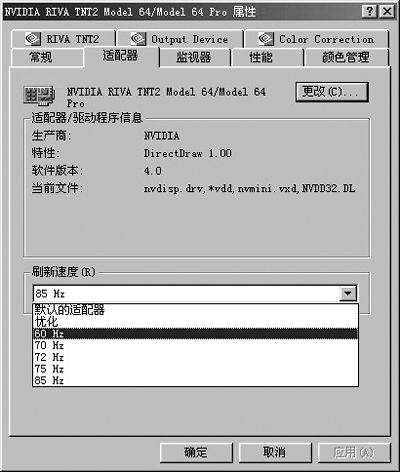 通常情况下我们并不了解摄像头的拍摄频率是多少,但是我们知道显示器的频率是多少,并且还可以通过显示属性窗口中的屏幕刷新频率进行更改(图1)。用最为烦琐的方法,逐步地改变显示器的刷新频率,并把摄像头对着屏幕,然后在预览窗口中观察。在某个频率下预览窗口的显示效果不再闪烁了,则代表两者的频率已经保持统一了。这时再进行视频捕捉,只要把显示器调到刚才试验结果的刷新频率之后(通常为60Hz),拍摄的画面就不再闪烁了。