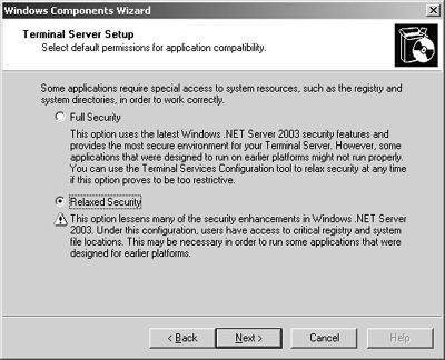 作为终端服务器的主机必须安装Win 2000 Server操作系统或者安装最新的Win 2003企业版的操作系统。现以Win 2003企业版为例(Win 2003企业版中所带的终端服务功能非常实用),首先打开“控制面板→添加或删除程序→添加/删除Windows组件→终端服务器”或“终端服务器授权”(没有授权的Win 2003终端服务器只能使用120天),随后按照安装向导一步步完成后面的安装。要注意选择宽松安全模式(图1),最后便是复制的过程了。这样终端服器就安装好了。