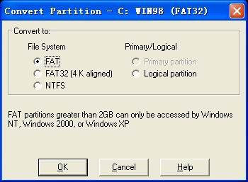运行PM,进入主界面,选择欲转换的分区,点击鼠标右键并选择“Convert”,弹出如图2所示的“分区转换”对话框。在这里我们可以选择所需要的转换类型。选择好后按“OK”按钮确认。