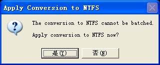 这里需要注意的是,如果选择将一个非NTFS格式的分区转换为NTFS格式,PM由于不支持将它加入到批处理队列,所以此操作必须立即执行,而不是加入队列等用户按“APPLY(应用)”按钮时才执行。此时PM会弹出信息窗口(图3),让用户确认是否立即进行转换。