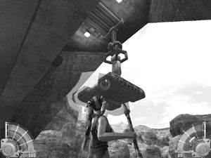 Lannik对你的到来早有准备,他炸毁了与你停泊地点连接的天桥。从停机坪后面的建筑平台走,跳上浮空小艇,来到对面的大厦。走右边的路,再度上到更高的平台,对面的箱子后边隐藏着一个类似ASP型的Lannik。只要在它开启防护力场的间歇,用热量炸弹解决就可以了。跳到左边的停机坪上,一路通过路障向右走,下面又有一个DROID,如法炮制。从左面的大楼来到Lannik的建筑物里。CP后,进楼上电梯,Lannik自大地放出四个此前的战斗DROID,就在原地不动,掏出4个热量炸弹,对准扔过去,轻松搞定。Lannik终于老实了,无奈之下将纳·萨达上的DROID工厂地址告诉你。
