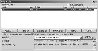 运行Nero Burning ROM,在主窗口中选择“其他选项”菜单中的“编码文件”命令,接着会弹出“编码文件”对话框(图2),单击“增加”按钮,将要转换的音频文件导入进来,接着在“输出格式”处的下拉列表中选择输出格式,然后单击“设置”按钮,设置音频文件的码率、采样频率等参数。最后选择“继续”按钮进行编码转换。