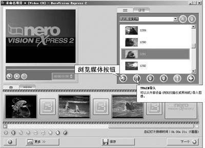 在Nero StartSmart窗口中选择“照片和视频”下的“制作视频光盘幻灯片显示”,即可启动NeroVision Express 2,直接进入幻灯片制作界面(图4)。