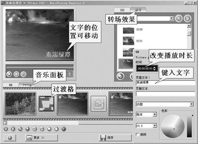 (3)图片之间还应加上转场过渡,否则就太显单调了。在媒体库面板中选择“显示转场”面板,从中选择一种转场特效,将它拖入两个图片之间的过渡格中。过渡的长度也可以进行设置,方法与设置图片差不多,双击过渡格中的转场效果,会弹出它的属性面板,你可在其中调整过渡的时长及过渡的有关参数。VCD相册自然少不了音乐,音乐的添加非常简单:选择音乐面板,将音乐文件拖到音乐面板中就行了,音乐播放的时长会自动和视频部分相适应,视频播放完,音乐会自动停止。