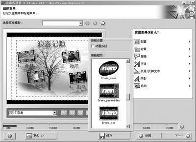 在“创建菜单”页面(图6)中先从“配置”当中选择一种菜单样式,然后为菜单选择背景,“背景”包括背景色、背景图片、背景视频和背景音乐,可让菜单变得有声有色。接下来设置选单按钮的样式,NeroVision Express内置了很多按钮样式,大部分都很酷,选一个你喜欢的吧。另外别忘记设置一下字体和阴影效果,最好还通过“页眉/页脚文本”给选单画面加上标题,这样可让你的VCD选单看起来比较漂亮。