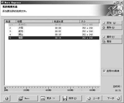 这次要运行的是Nero Express,在Nero Express启动界面中选择“视频/图片”下的Video CD、Super Video CD或MiniDVD。如果制作MiniDVD必须事先将DVD的光盘文件准备好。接下来会弹出视频文件刻录向导(图7),点击其中的“添加”按钮将视频片段添加至列表中。接下来在列表选择某个片段,并单击“属性”按钮,会弹出MPEG轨的数据对话框(图8),选择“菜单”选项卡,在“标题”处填上为该片段取的名称,然后拉动播放滑块至该片段中最具代表性的景观处,这样选单中显示的画面就是滑块位置的画面。