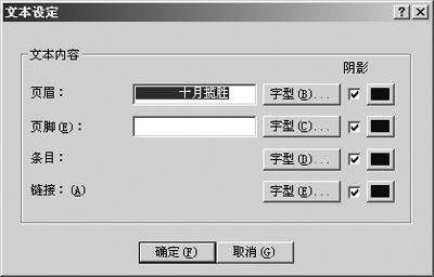 在点击“下一步”之前一定要选择“启用VCD(或SVCD)菜单”,然后才会进入菜单编辑页面(图9)。首先设定菜单画面的布局方式,单击“编排”按钮,然后在弹出的“版面设定”对话框中选择一种预设的布局方式,如“6缩图”方式。接下来设置“背景”,这里的菜单背景比较简单,可使用色彩或图片作为背景。最后点击“文字”按钮,并在弹出的“文本设定”对话框(图10)中设置菜单的文字。你可将页眉设置为菜单的标题,如果标题不居中可在“页眉”处的文字框中先加入一些空格,再输入文字。字形选项是用于设置菜单文字的字体、字号、颜色的。菜单设置完成之后即可进入刻录操作。