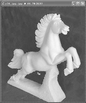 1.首先开启Photoshop7.0,打开一幅图片,利用魔棒工具或其他工具选取要转化成透明图像的部分,这里我选取的是图片中的奔马。如图1。