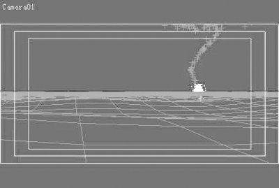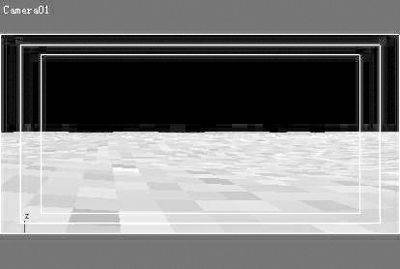 1.在建立命令面板中点击Cameras按钮,在视图中创建一架目标摄影机,激活透视图后按C键将透视图切换为摄影机视图。点击工具栏的Render Scene按钮打开渲染设置窗口。在Output Size项中将Width设置为400,将Height设置为200,点击Close按钮关闭窗口。在摄影机视图标签上点击鼠标右键,选择Show Safe Frame命令显示出安全框,按照图7所示调整摄影机视图的观察角度。