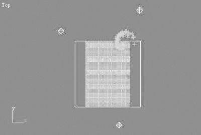 3.在侧视图中沿Y轴向上复制一条曲线,位置如图9所示。在建立命令面板中点击Space Warps按钮,点击其中的Vortex按钮在顶视图中创建漩涡图标。使用前面的方法让漩涡跟随复制的曲线运动,选中漩涡图标进入修改命令面板,修改Time On参数为-100,Time Off参数为100,Taper Length参数为1000,Taper Curve参数为1.1。在Capture and Motion项中设置Axial Drop参数为0.14,Damping参数为1.8,Orbital Speed参数为0.9,第二个Damping参数为3,第三个Damping参数为0,使用工具栏上的绑定空间扭曲工具将漩涡与超级喷射粒子绑到一起,如图10所示。