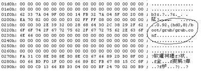 接着修改Grub的重要的文件stage2。重新启动到Windows 2000下,用explore2fs-1.00-pre4(用Windows访问ETX分区)导出stage2,然后用UltraEdit打开该文件(见图),将其中的(hd0,8)改成(hd0,7),保存退出。