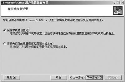 以后,当重新安装了Office XP,只要再次启动该向导,并在“保存或恢复设置”窗口中点选“将原先保存的设置恢复应用到本机上”,再选取那个设置文件,便可以快速恢复先前设置的工作环境信息了。