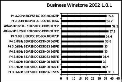 与SYSmark类似的测试方法,模拟相关软件的操作,对电脑的性能进行评分。Content Creation Winstone 2003测试系统的Web、图形和多媒体等方面的性能;而Business Winstone 2002则测试系统商业办公性能,最新版基本上包括了2003年的应用软件,其中新版本的Content Creation Winstone 2003引入了LightWave3D(3维图像制作工具),在支持SSE2、超线程和具有高带宽优势的平台上得到的分数相对高些。商业用户必须着重注意Business Winstone的得分,这对于日常的商业软件应用有着客观的评价作用,测试得分越高则表示性能越好。图1是一些测试数据,供读者参考。