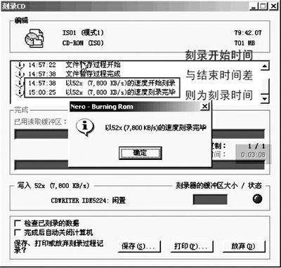 刻录机常用的刻录软件(不少刻录机产品在附送的软件中都包含Nero),使用在相同的平台、相同的刻录盘片、刻录同样容量的数据能真实反映出不同刻录机的性能。通常用刻录时间的长短来分辨刻录机性能的高低(图3),刻录时间越短则刻录机性能相对较高。