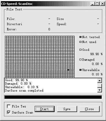在追求速度的同时,我们不能忽视刻录的品质,我们可以用Nero CD Speed中的ScanDisk选项(图4)进行简单的刻录品质检测。测试结果中,绿色方块表示数据正常,黄色代表数据不稳定,而红色代表出错的数据。(注:刻录品质和刻录速度有关,详情大家可参考《电脑报》第17期文章)