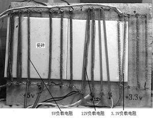 次级把电源20芯插头的红线黑线都引出来分别连在一起,黑线再与所有4芯插头的黑线连在一起,以模拟主机的实际使用情况。负载电阻用2KW的电炉丝截成1.1Ω、2Ω、2.5Ω、3.5Ω……作为负载电阻。使用电炉丝作负载的目的是价格低,功率大,作为负载时因通过的电流不大,温度不高,阻值变化不大,便于计算负载功率,图2是测量时的电阻板。