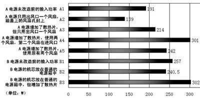 2.从A1、A2与B1、B2的实验来看,不用双风扇或大尺寸风扇,只用一个普通单风扇,电源的最大输入功率都减小了,A电源从191W减小到139W,减少了27.2%,B电源则从257W降到240.5W,减小了6.4%。似乎说明双风扇和大尺寸风扇电源的效果好于普通单风扇结构的电源。但是双风扇或大尺寸风扇电源的内部空间已被风扇占用较多,很难在散热片上再增加散热片以增加散热效果,提高电源功率的难度很大。若把电源的机芯装入普通的单风扇电源外壳,可以在散热片上增加散热片,从而大大改善电源的散热效果,正如实验A3和B3所示,A电源的最大输入功率达到214W,B电源在整流块表面处温度为53℃的输入功率更达到302W(这可是能够连续工作的输入功率),其散热效果大大优于双风扇或大尺寸风扇的散热效果。因此可以说,采用双风扇或大尺寸风扇的结构并不一定是最好的结构,它的最大优点是可以降低风扇的噪音,但是在增大电源的输出功率方面,实际意义并不大。