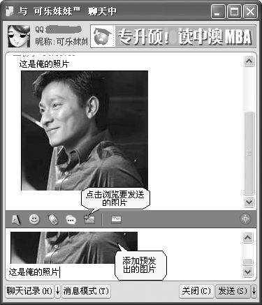 图1就是新版本QQ里提供的用聊天窗口显示图片的功能,只要你安装了新版本的QQ聊天工具,点击快捷功能按钮(即快捷设置栏的左边第五个按钮),在弹出的浏览框里选择要让对方观看的图片,点击“确定”后,图片就会自动添加到信息框里了,只要点击“发送”,对方就可以像收信息一样地收到并观看你发送的图片了。