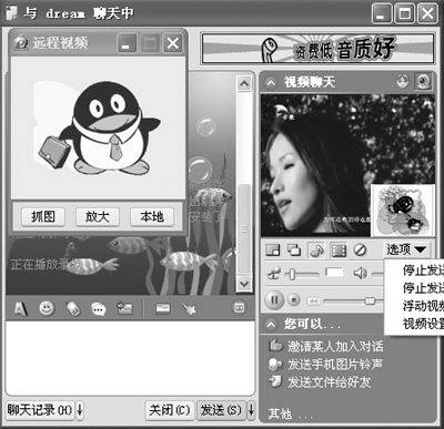 音、视频聊天模块又增添了给好友播放录像的功能,用户只要点击聊天窗口中的视频聊天功能的按钮,选择“放录像给对方看”按钮,就可以选择视频文件播放了。一边互相欣赏动感视频,一边还可以在聊天窗口中进行交流,这种感觉是不是更爽(图3)!