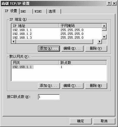 2.右击“控制面板→网络和拨号连接”中的“本地连接”,选“属性”。在“本地连接属性”窗口中查看TCP/IP协议的属性,在出现的“TCP/IP协议属性”窗口中可以看到已设置的一个IP地址,单击“高级”,在“高级TCP/IP设置”中通过添加IP地址为服务器网卡绑定多个IP地址(注意所添加的IP地址不能与网络中的其他主机地址重复),如图1所示。这样就可以在一台Web服务器上建立多个Web站点,并且每个站点用一个独立的IP地址。