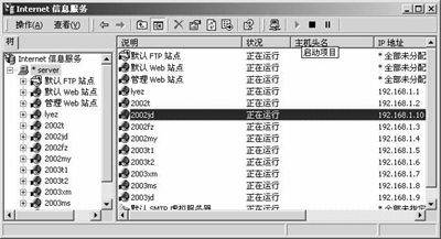 2.在“开始→程序→管理工具”中选“Internet服务管理器”。如果没有此选项,可以通过“控制面板→添加/删除程序→添加/删除Windows组件”来添加“Internet信息服务”组件)。在出现的窗口中右击服务器名称,选“新建→Web站点”,出现“新建Web站点”向导。在“Web站点说明”中输入站点名称,如:lyez;在“IP地址和端口设置”中指定IP地址:192.168.1.1,端口号用默认的80即可;在“Web站点主目录”中设定站点文件所在的目录“E:\lyez”,选定“允许匿名访问此Web站点”(否则登录站点时需用登录名称和密码,比较麻烦);在“Web站点访问权限”中用默认设置;完成Web站点的添加。用同样的方法添加其他站点,如图2所示。