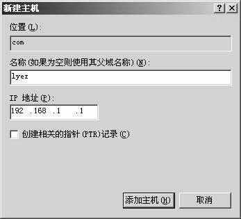 2.新建主机:在DNS控制台的“正向搜索区域”中右击区域名“com”,选“新建主机”。在“新建主机”窗口中添入主机名(Web站点名)及其对应的IP地址,单击“添加主机”,如图4所示。用同样的方法在域中新建其他Web站点主机,结果如图5所示。