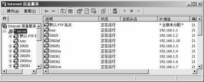 1.在“开始→程序→管理工具”中选“Internet服务管理器”,在出现的窗口中右击服务器名称,选“新建→FTP站点”会出现“FTP站点创建向导”:在“FTP站点说明”中输入名称,如:lyez;在“IP地址和端口设置”中指定IP地址:192.168.1.1,端口号用默认的21即可;在“FTP站点主目录”中设定站点文件所在的目录“E:\lyez”;在“FTP站点访问权限”中选“读取”和“写入”;完成Web站点的设置。用同样的方法添加其他站点,如图6所示。