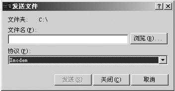 接下来,便可输入“Xmodem”命令,“Xmodem”命令与“Tftpdnld”命令格式稍有不同,“Xmodem命令”格式为“xmodem [-cyrx] <目的地文件名>”(如rommon1>xmodem c2600-js-mz_120-14)。当屏幕上出现“Ready to receive file”字样时进入超级终端窗口,点击“传送→发送文件”,在弹出的“发送文件”对话框(见图)中选择“Xmodem”,并选定要发送的IOS文件,点击发送即可。