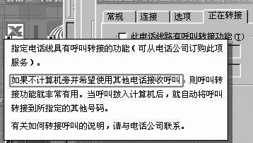 在“拨号网络”中查看“我的连接”的属性,在“常规”一栏的“连接方式”中单击“设置”,在新的对话框中选择“正在转接”项,接着单击对话框标题栏中的问号,然后单击该对话框中的“此电话线路有呼叫转接功能”项目,就会看到图示的病句──“如果不计算机旁并希望使用其他电话接收呼叫”,我想应该是“如果不在计算机旁并希望使用其他电话接收呼叫”。 线索提供者:snowy