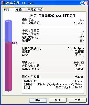 2.在1.exe上点击鼠标右键,选“用WinRAR打开”,接着点工具栏上的“信息”按钮,这时会弹出包含用户身份校验信息的对话框。OK,一点问题也没有(图1)。