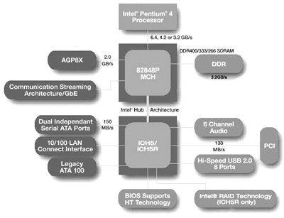 那么i848P又有什么样的技术特点呢?有传言说,i848P芯片组其实就是i865芯片组中的次品。且不说这些传闻是真是假,就英特尔官方公布的资料看,i848P的MCH芯片即82848P,除了不能够对于双通道内存模式提供支持之外,别的都与82865PE极为相似,都支持800MHz前端总线频率超线程的P4处理器、支持最高DDR400规格的内存、支持AGP 8×以及CSA技术。而i848P的ICH芯片组搭配ICH5R芯片一样可以具有SATA RAID功能,如果只搭配ICH5芯片的话就只支持独立SATA硬盘的使用,而对于USB2.0的支持也一样可以提供8个端口的支持。从理论上说,i848P芯片组只是i865PE单通道内存的版本。被命名成为i848P只是市场的策略──看上去更像i845PE的升级版本而已,实际上82848芯片的针脚数也是与82865一样同为932脚,封装方式也同样为FCPGA方式。