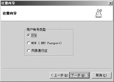 安装后第一次使用要选择“注册向导”,如果你已经有了ICQ号码或MSN账号,就选择“已有的用户”,否则你可以选择“新申请用户”进行在线申请,申请的号码和账号在真正的ICQ上同样有效。接下来你就可以选择要注册的账号类型了。我们以ICQ为例,先选择第一项(图1),然后输入用户名,这里也可以不输入密码,而在以后的登录窗口中输入,这样注册过程就完成了,下面该登录了。