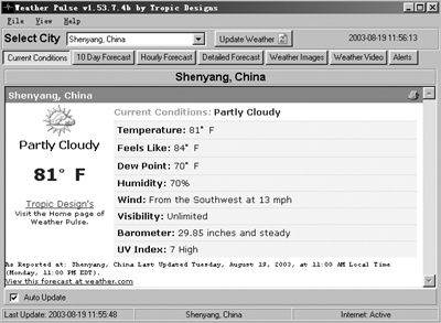 首先连上互联网,点击“View→Settings→City”,这里以查询沈阳的天气为例,点击“Add City”,将城市名称输入到“Enter your City or US Zip Code and Press the search button”栏,然后点“Search”按钮,从搜索列表中选择相应的名称,点“Save”保存退出,返回到主界面,从“Select City”下拉菜单选择城市名,软件自动下载天气数据,其中“Current Conditions”就是当天的天气信息了(图1),包括温度、湿度、露点、风速、能见度、气压、人们的舒适程度及紫外线指数,并以图标表示天气的变化特征;而“10 Day Forecast”则是该城市未来10天的天气预报,主要包括最低/最高温度和出现这种天气的概率。当有灾害天气的时候,便会在“Alerts”进行预报并发出声音警报。默认情况下,天气预报数据每隔5分钟会自动更新一次。