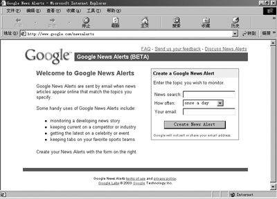 打开Google News Alerts的网站(http://www.google.com/newsalerts)后,首先要在“News search”一栏中输入你需要监控的新闻关键字。接着,再根据实际需要在“How often”中选择监控频率,一项是once a day(每天一次),另一项是as it happens(当新闻发生时),并在“Your E-mail”中输入接收信息的电子邮箱地址。最后,点击“Create News Alert”结束整个设置过程(图1)。