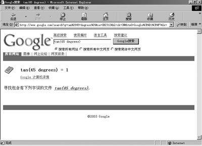 在Google网站(http://www.google.com)的搜索框中输入相应的算术表达式就可以进行计算了。不过,你可不要因为使用方法简单而小看了它,它的功能可不简单啊。它除了能进行基本运算以外,单位换算、三角函数、混合进制的计算都是它的拿手绝活(图3)。如果你对这些功能感兴趣,可以到Google的官方网站上了解更多的用法(http://www.google.com/help/calculator.html)。