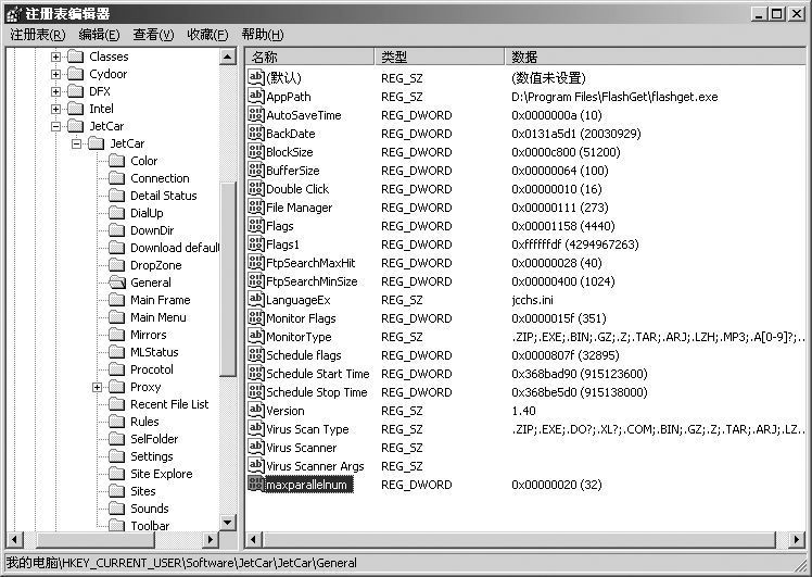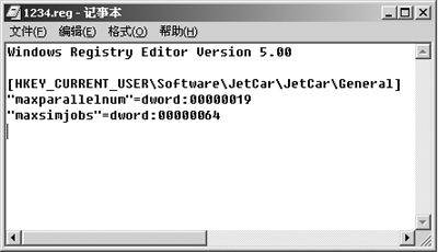 按照上述相同的方法打开注册表编辑器,找到:“HKEY_CURRENT_USER\Software\JetCar\JetCar\General”,在右边的窗口中新建一个“Dword”值,并命名为“maxsimjobs”,然后将键值改为你所希望的能同时进行下载的的最大任务数,如“30”,其最大值可高达“32767”。