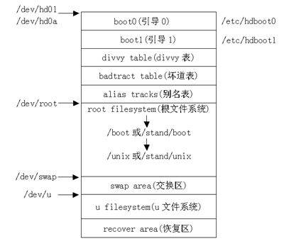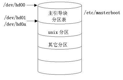 UNIX分区结构如图1,这里假设UNIX装在活动的第一分区。UNIX中把硬件全部当做文件来管理,第一个物理硬盘是/dev/hd00,第二个物理硬盘是/dev/hd10,依此类推;第一个物理硬盘的逻辑分区从/dev/hd01到/dev/hd04,/dev/hd0a特指活动分区。主引导程序、引导0和引导1在UNIX系统中都有备份,它们分别为/etc/masterboot、/etc/hdboot0和/etc/hdboot1。