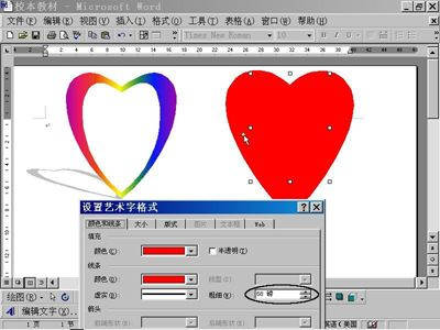 漂亮的“心”出来了。想要实心的,选定艺术字“O”,单击艺术字工具栏中“设置艺术字格式”,单击“颜色和线条”,将“填充”、“线条”颜色改为同一种色彩,把“粗细”改为几十磅,然后单击“确定”。再来看看你的“心”,够“真心实意”吧!如图2所示。