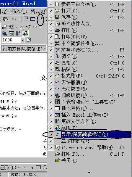 3.单击“常用”工具栏上的“其他按钮”,单击“添加或删除按钮”,选中“显示/隐藏编辑标记”,“常用”工具栏上出现该按钮(图4)。单击按钮凹下,则“现身”;单击按钮凸起,则可“隐身”。