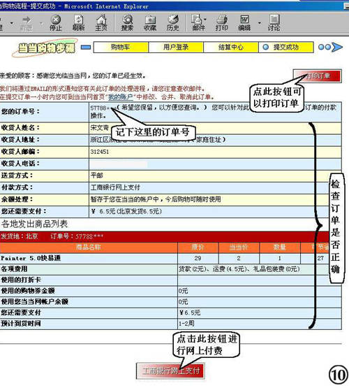 ⑩检查订单内容是否正确,确认后点击“工商银行网上支付”进行付款。